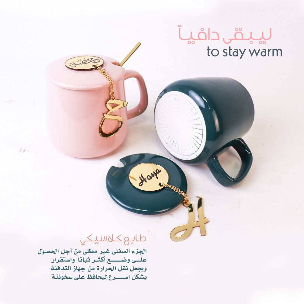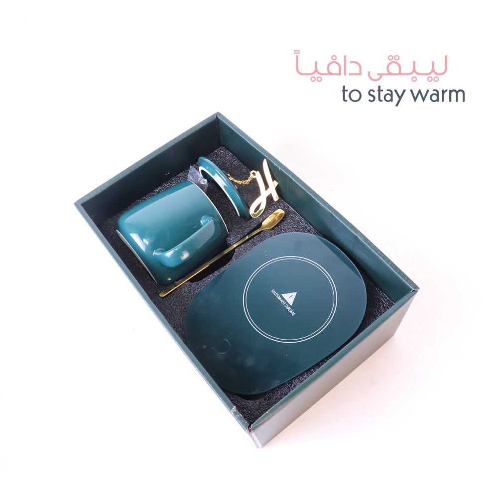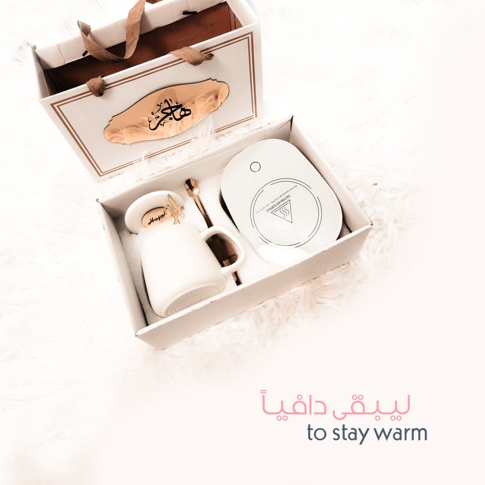 مع كل كوب ملعقة وجهاز تدفئة ليبقى الكوب دافئاً ، ويقدم بكيس فاخر بمرايا