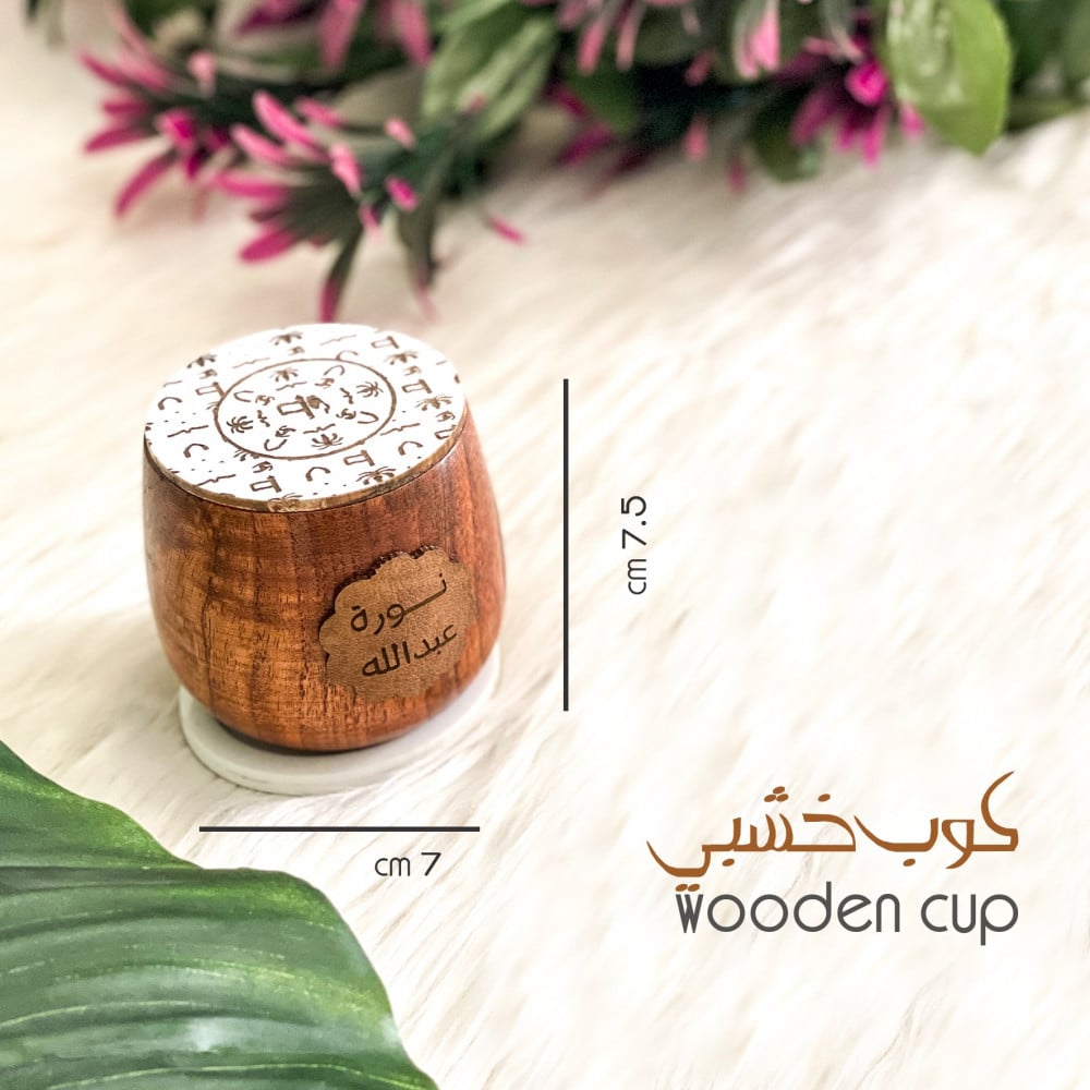 كوب خشبي جماله يمزج بين الماضي والحاضر ، يأتي معه قاعدة وغطاء من الأكرلك باللون الأبيض ، الغطاء ينقش عليه شعار يوم التأسيس ، يمكن إضافة الاسم على قطعة من الجلد .. مقاسات الكوب : الطول 7,5 سم × العرض 7...