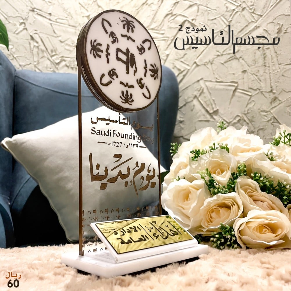 Read Moreمجسم بشعار يوم التأسيس السعودي ( يومُ بَدْينا ) صنع بكل أتقان وإحتراف ليتميز معنا من يقتنيه أو يهديه ، يحتوي على أستاند من الأكرلك الأبيض مزين بمرايا ذهبية لإضافة إهداء العميل .. المقاسات :